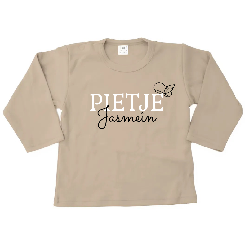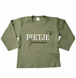 Dit shirtje is verkrijgbaar met lange mouwen. Ze zijn verkrijgbaar in drie varianten, maat 56 t/m 110 , in de kleur Leger groen en Zand.